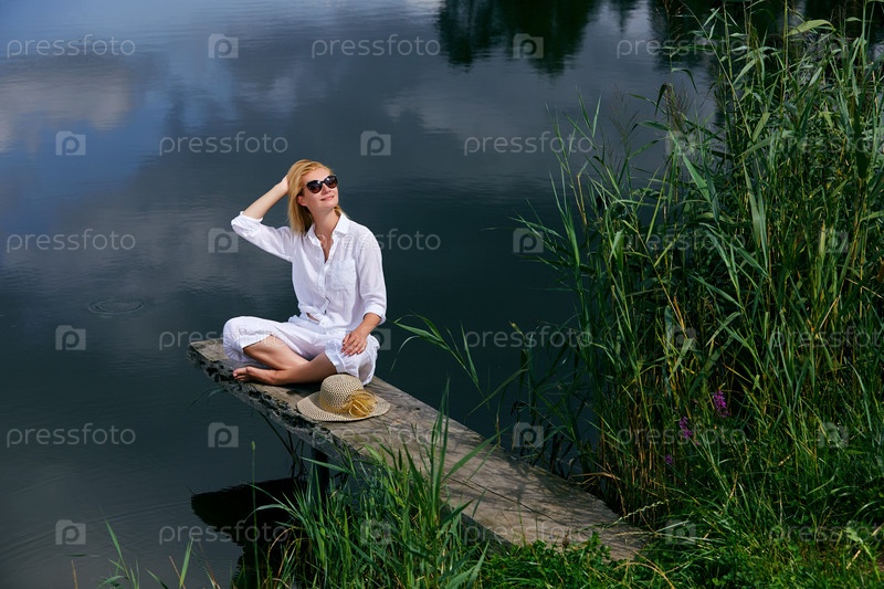 Молодая женщина отдыхает рядом с озером
