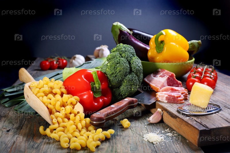 Овощи, бекон и сыр для приготовления макаронных изделий