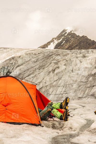 Альпинист отдыхает в палатке на леднике