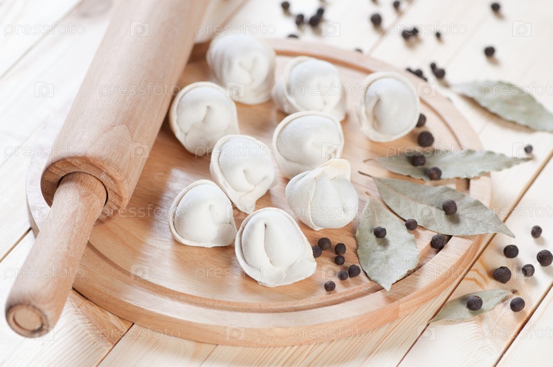 Сырые пельмени, черный перец, лавровый лист и скалка