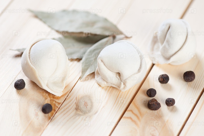 Сырые пельмени с черным перцем и лавровым листом на деревянных досках