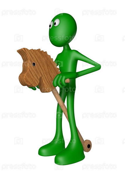 Маленький зеленый человек на игрушечном коне - 3d иллюстрация