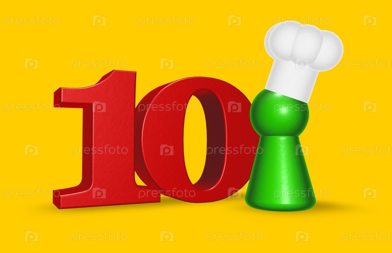 Кукольный повар и цифра 10 на желтом фоне. 3D иллюстрация