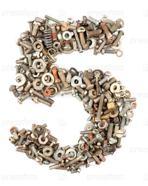 Число пять из гаек и болтов на белом фоне