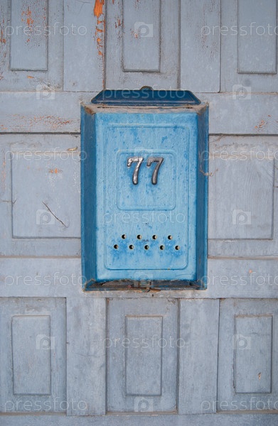 Синий почтовый ящик на серой двери