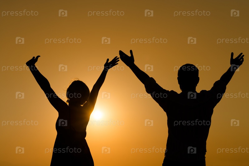 Влюбленная пара с поднятыми рукам любуется закатом