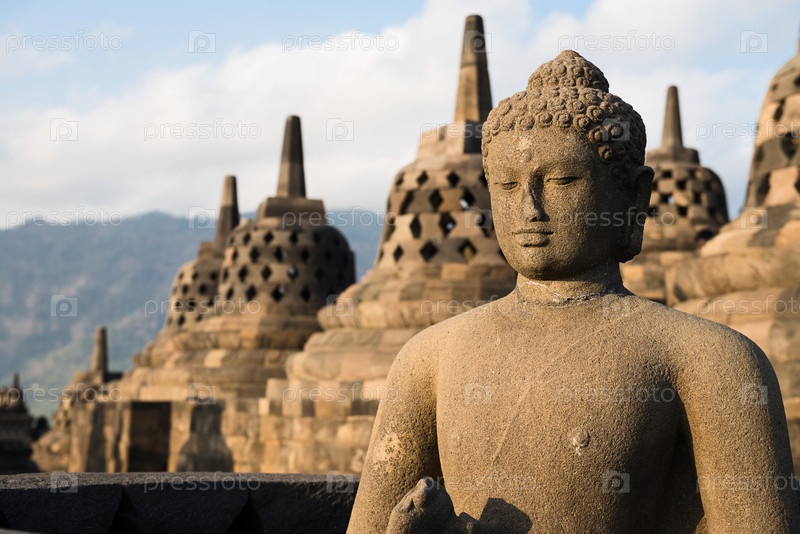 Статуя Будды и ступы в храме Боробудур, Индонезия