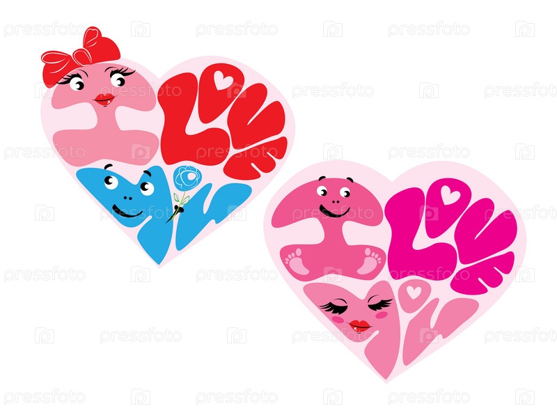 Сердца из слов Я ТЕБЯ ЛЮБЛЮ со смешными мультипликационными лицами
