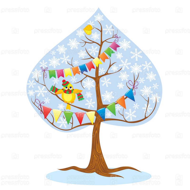 Один из четырех сезонов. Зима. Дерево и смешные птицы