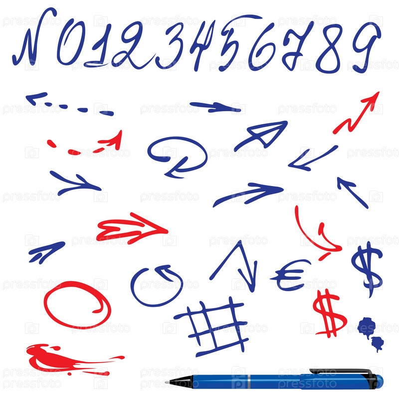 Набор нарисованных от руки цифр и стрелок