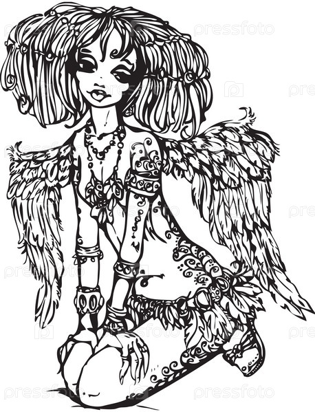 Девушка-ангел с татуировками на ее теле. Иллюстрация в стиле аниме