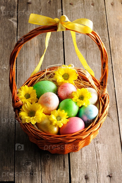 Цветные пасхальные яйца в корзине
