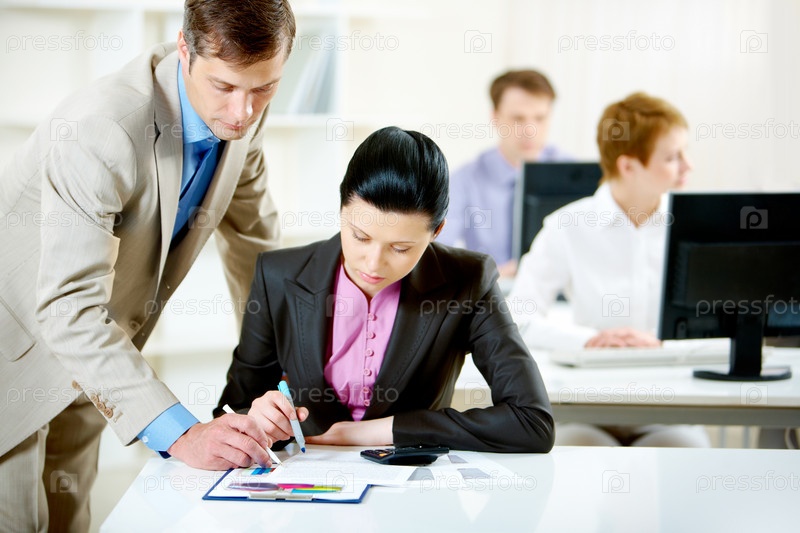 Бизнесмен и бизнес-леди работают над одним проектом