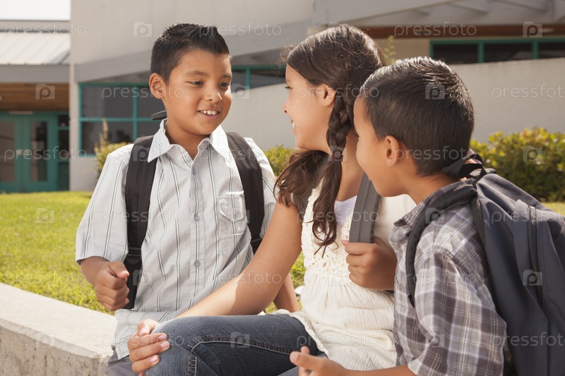 Симпатичные братья и сестра говорят возле школы