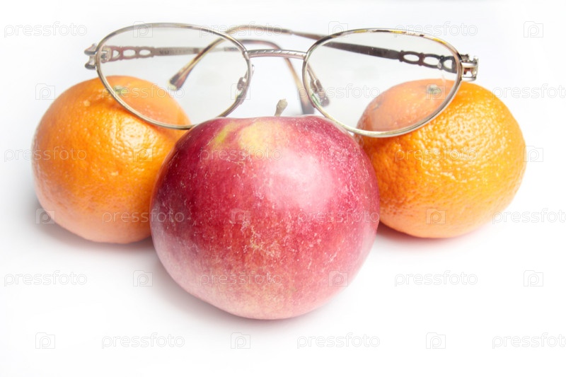 Старые очки и спелые свежие яблоки и мандарины как символ здорового питания