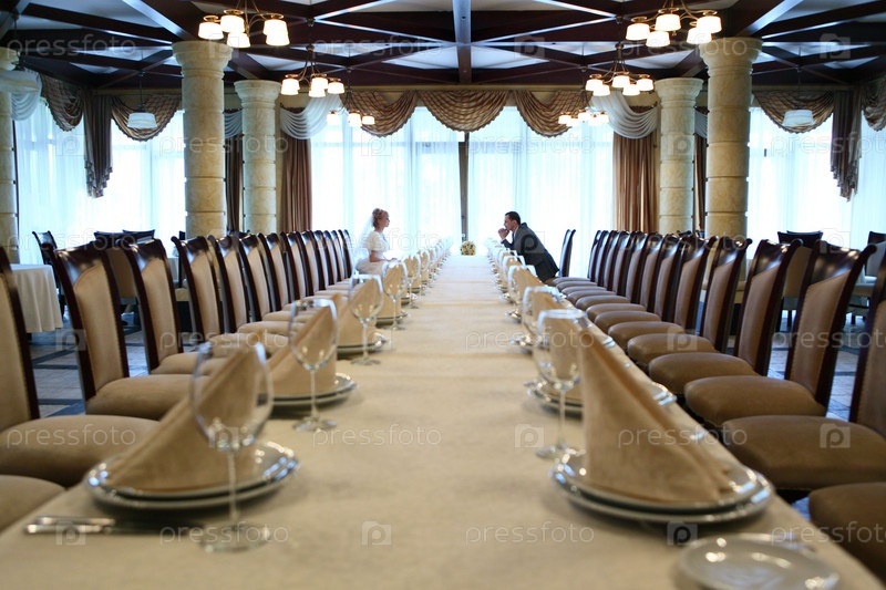 Пустой банкетный зал с женихом и невестой