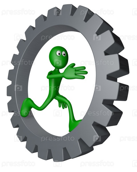 Маленький зеленый человек бежит внутри зубного колеса. 3d Иллюстрация