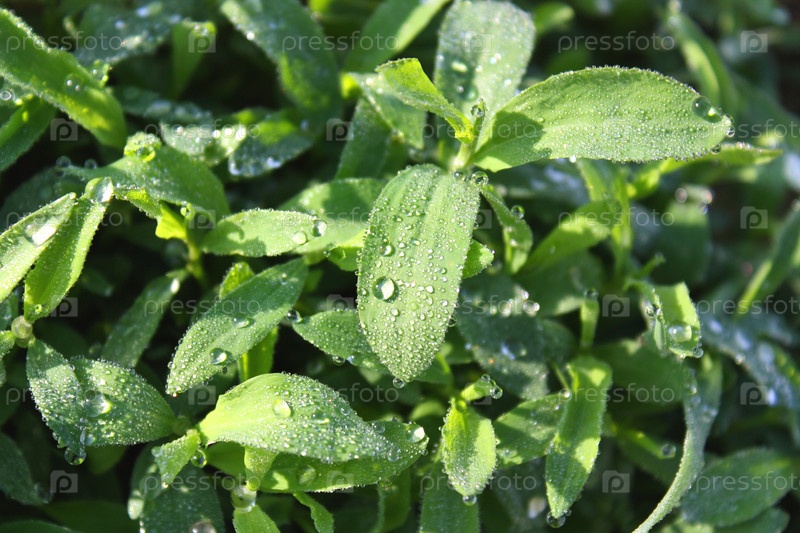 Капли росы на траве в лучах солнца