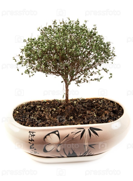 Сухое дерево в зеленом японском горшке на белом фоне