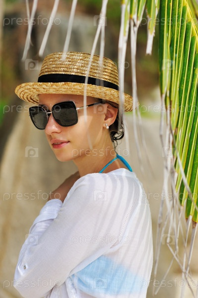 Женщина в солнцезащитных очках у пальмы