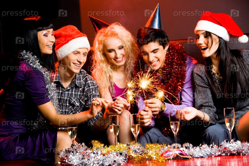 Портрет группы молодых людей, расслабляющихся в ночном клубе
