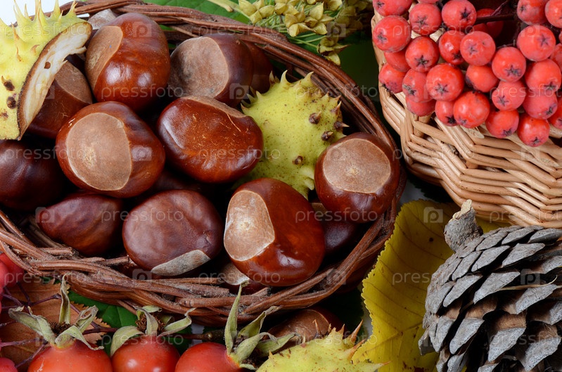 Каштаны на осенних листьях