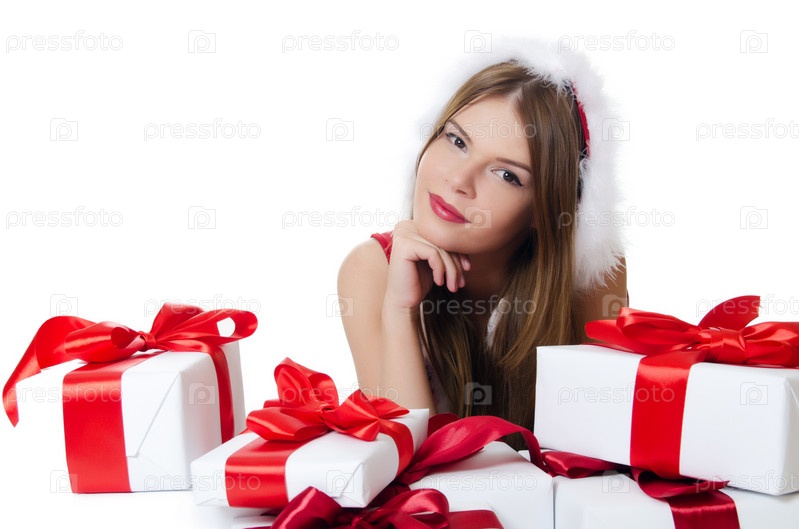 Рождественская девушка с подарками, изолировано