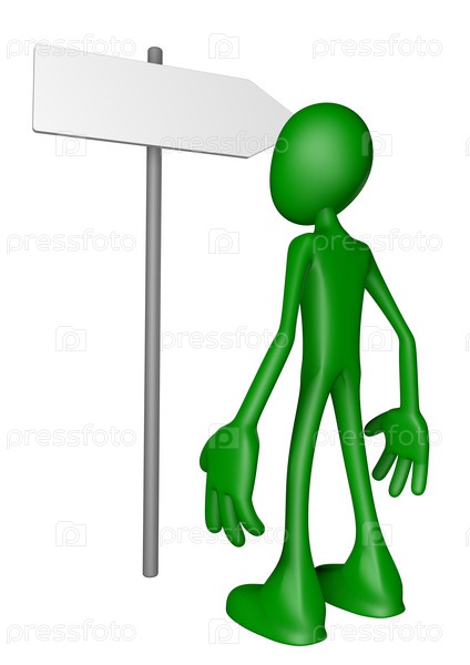 Маленький человек и дорожный указатель - 3d иллюстрация