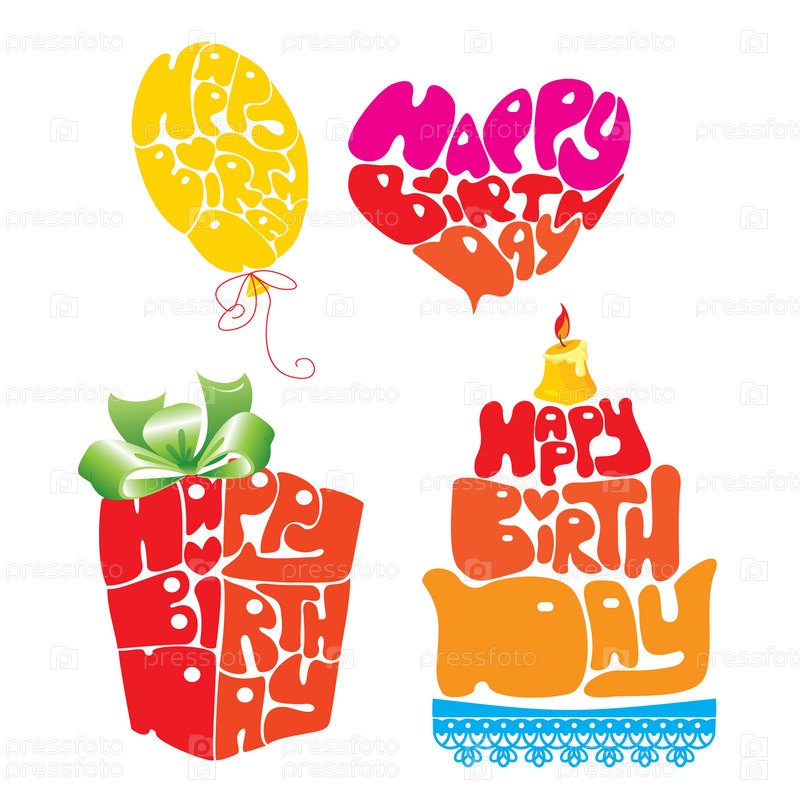 Сердце, шарик, торт, подарочная коробка, текст "счастливого дня рождения"