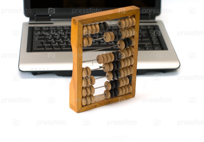 Старые деревянные счеты и ноутбук, изолированные на белом фоне