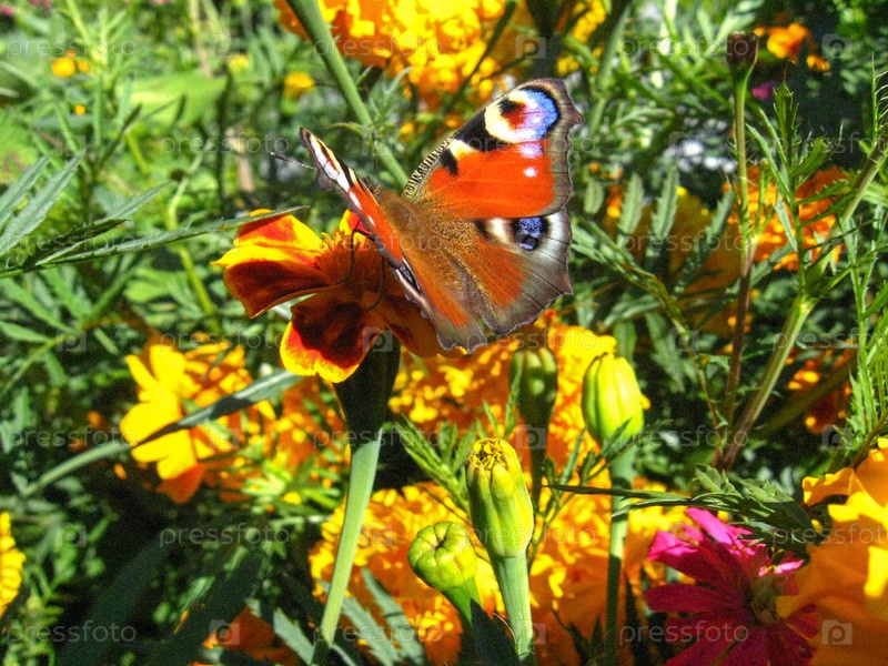 Бабочка Павлиний глаз на бархатце