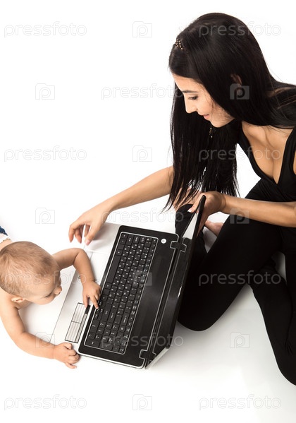 Молодая красивая женщина и мальчик на белом фоне. Женщина держит ноутбук