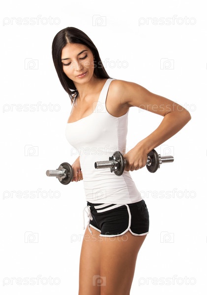 Симпатичная спортивная девушка работает с гантелями