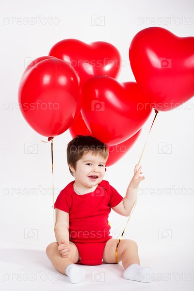 Маленький мальчик с красными шарами. День Святого Валентина