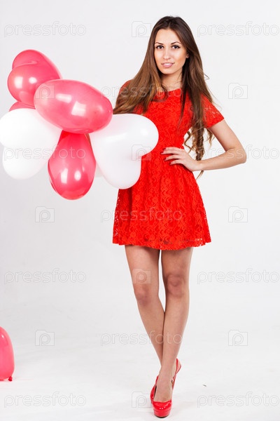 Женщина держит красные шары в форме сердца. День Св. Валентина