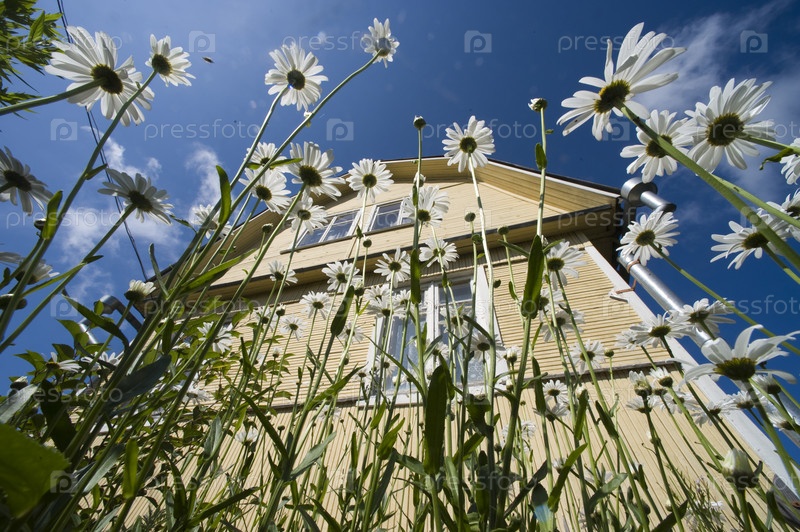 Ромашки и коттедж в летний день