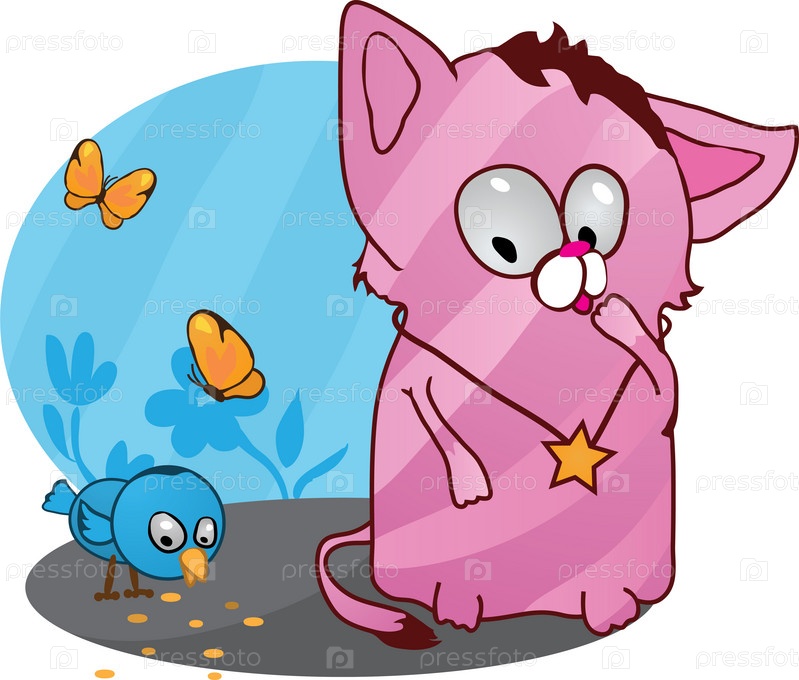 Милый забавный котенок с птицой, векторные иллюстрации