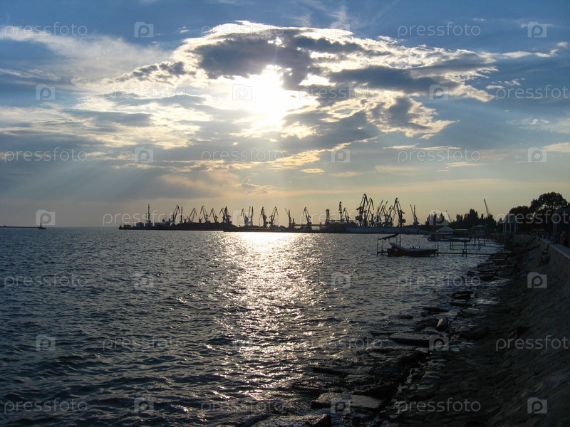 Панорама вечернего моря с доками