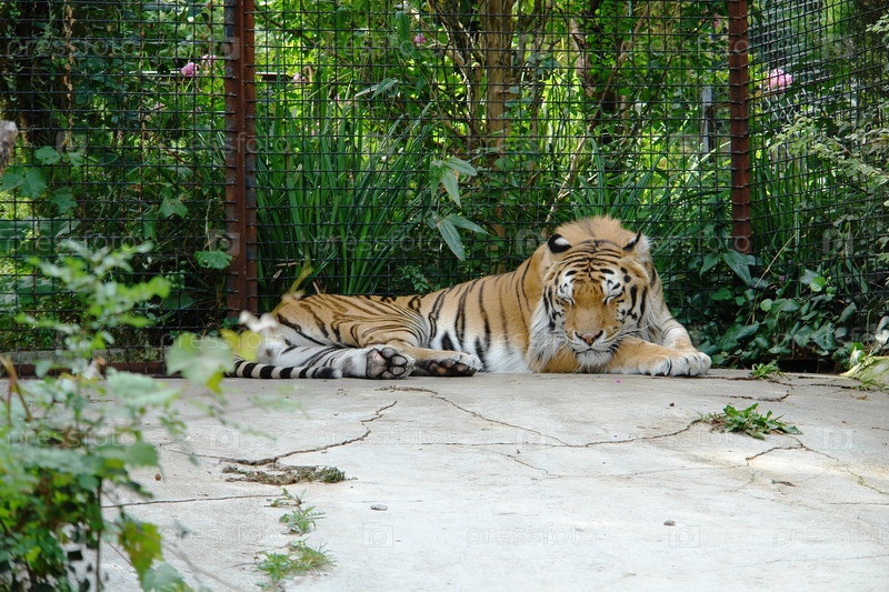 Амурский тигр спит в клетке в зоопарке