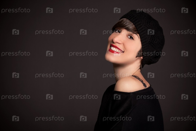 Улыбающаяся девушка в французском стиле на сверкающем фоне