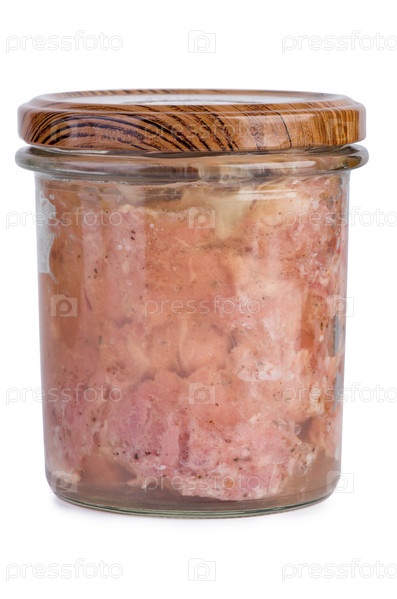 Тушенка в стеклянной банке оригинальной формы. Белый фон