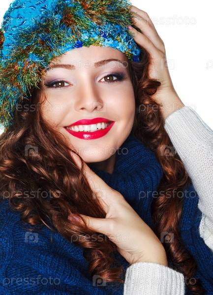 Счастливая брюнетка в вязаной синей шапке и свитере