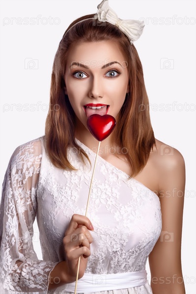 День Святого Валентина - счастливая смешная женщина с красным сердцем