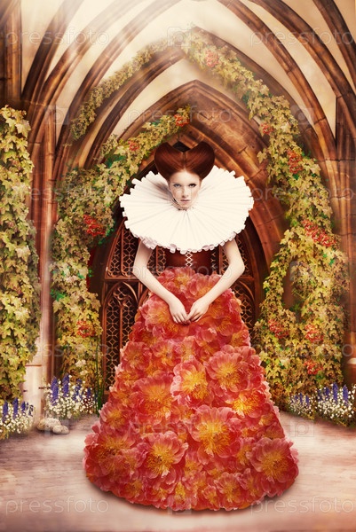 Рыжеволосая герцогиня в красном платье и жабо в древнем аббатстве