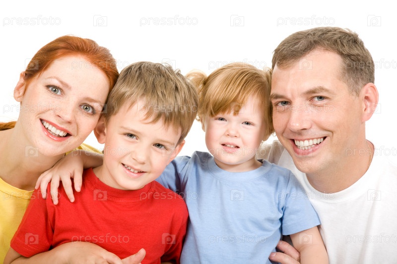 Портрет семьи, смотрящей на камеру на белом фоне