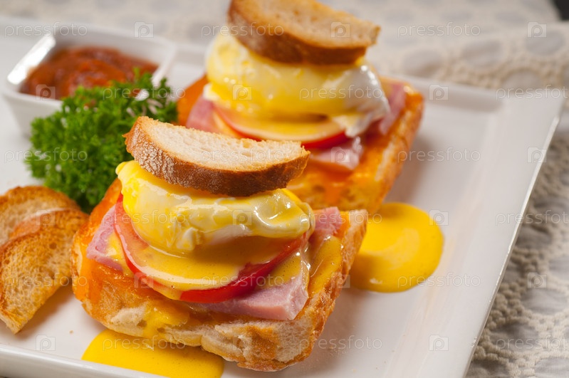 Яйца бенедикт на хлебе с помидорами и ветчиной