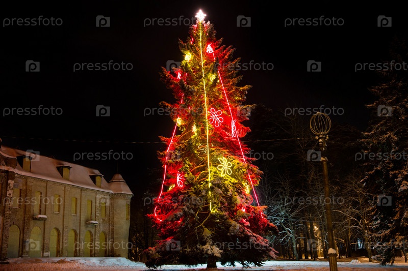 Рождественская елка в центре села в ночное время