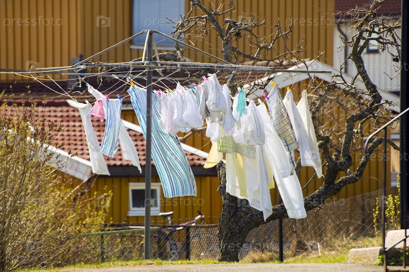Белье после стирки сушится во дворе. Близ Осло, Норвегия