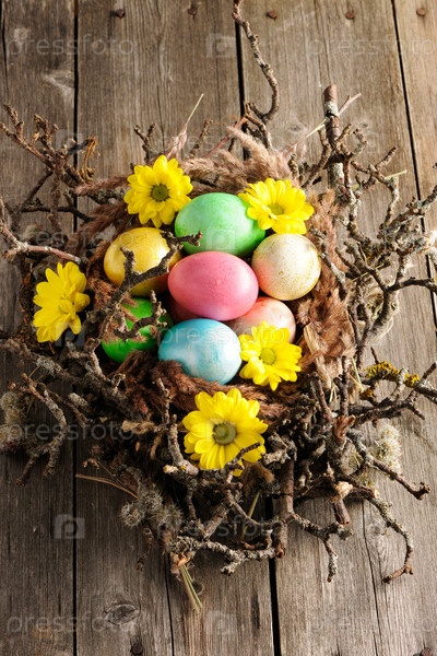 Цветные пасхальные яйца в гнезде