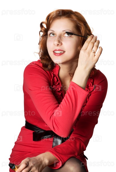 Девушка в красном платье делает макияж